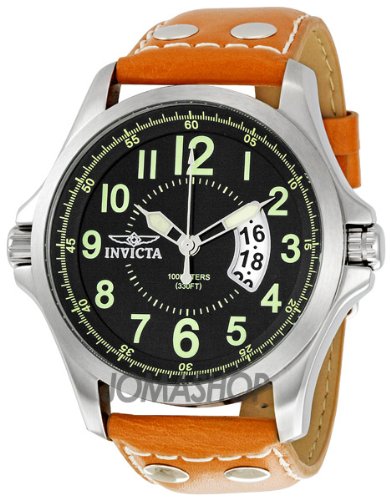 by InvictaStainless steel case with a brown leather strap with contrast stiching. Fixed stainless steel bezel. Black dial with luminous hands and Arabic numeral hour markers. Minute markers around the outer rim. Luminiscent hands and markers. Date display appears at the 3 o'clock position. Swiss quartz movement. Scratch resistant flame fusion crystal. Solid case back. Case diameter: 48 mm. Tang clasp. Water resistant at 100 meters / 330 feet. Invicta Black Dial Leather Bracelet Mens Watch 0787.